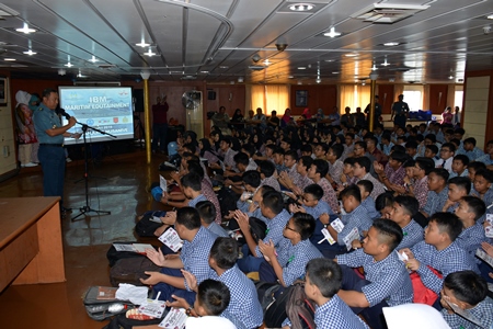 Para peserta IBM Maritime Edutainment sedang mendengarkan pengarahan Asops Pangkolinlamil Kolonel Laut (P) Rahmad Wahyudi, S.E.MNOL - Jakarta, Kapal – kapal perang milik Komando Lintas Laut Militer (Kolinlamil) kembali memfasilitasi kegiatan sosialisasi tentang Kemaritiman. Kali ini KRI Tanjung Nusanive 973 dan KRI Bintuni yang sedang sandar di Dermaga Kolinlamil, Tanjung Priok, Sabtu (30/7) menjadi sasaran kunjungan dan sosialisasi bagi ratusan peserta program IBM Maritime Edutaintment dalam rangka hari anak nasional dan HUT ke-55 Kolinlamil.