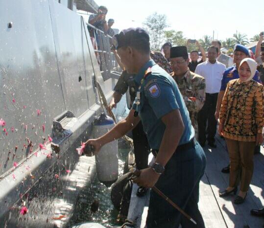 Danlanal Bengkulu Letkol Laut (P) Fajar Rusdianto memecahkan kendi di lambung kapal sebagai tanda peresmian KAL Pulau Mego II-2-15 di Dermaga Nusantara Pulau Baai Bengkulu, Kamis (16/2).MNOL, Bengkulu - Pangkalan Angkatan Laut (Lanal) Bengkulu mendapatkan Alutsista baru yakni Kapal Angkatan Laut (KAL) Pulau Mego II-2-15 dari Markas Besar Angkatan Laut (Mabesal). Peresmian pengunaan KAL Pulau Mego II-2-15 ditandai dengan acara penyambutan dan penyiraman air kembang ke lambung kapal oleh Gubernur Bengkulu yang diwakili Asinten I Dr. Iskandar ZO didampinggi Kapolda, Danrem 041 Gamas, Wakil Walikota dilanjutkan pemecahan kendi oleh Danlanal Bengkulu di Dermaga Nusantara Pulau Baai Bengkulu, Kamis (16/2).