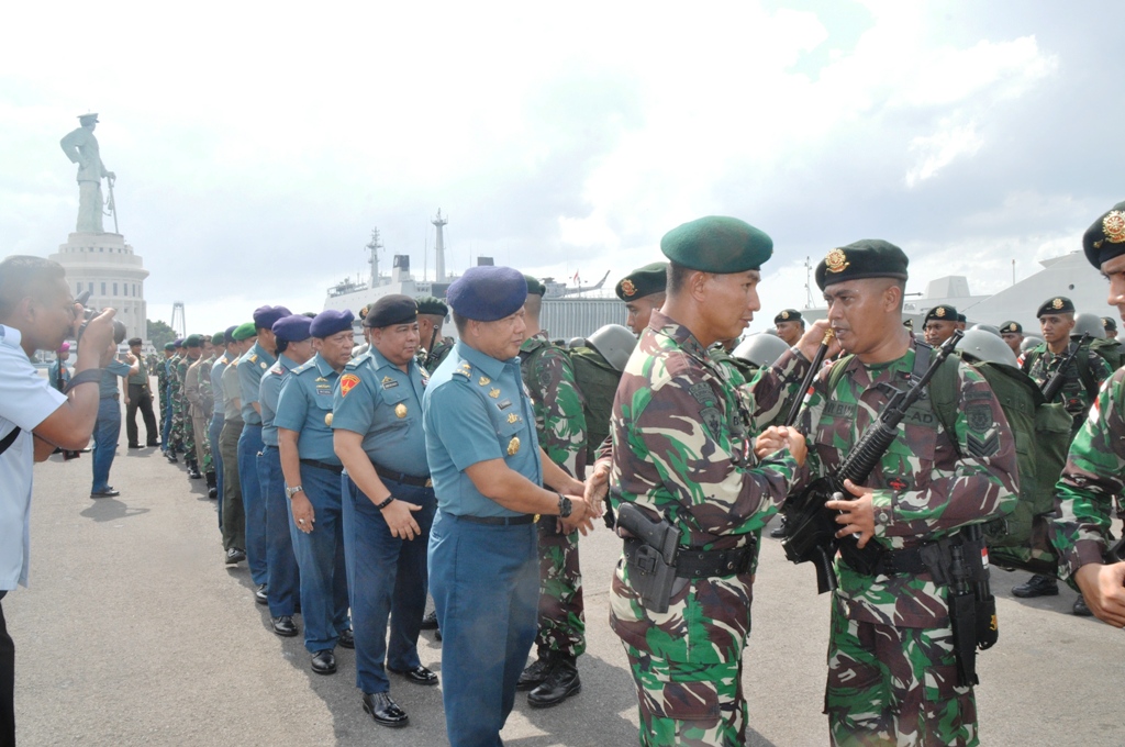 Prajurit Batalyon Infanteri TNI AD bersama KRI Tanjung Kambani-971 menuju Perbatasan NKRI - Papua NuginiMNOL, Surabaya - 450 prajurit Batalyon Infanteri (Yonif) Para Raider 503/18/2 K TNI AD berangkat dengan KRI Tanjung Kambani-971, guna mengemban bakti negara menjadi Satuan Tugas (Satgas) Pengamanan Perbatasan Republik Indonesia-Papua Nugini. Upacara pelepasan dipimpin oleh Panglima Divisi Infanteri (Pangdivif)-2/Kostrad Mayjen TNI Benny Susianto, di Dermaga Madura Koarmatim, Ujung Surabaya, Jum’at (17/2)).